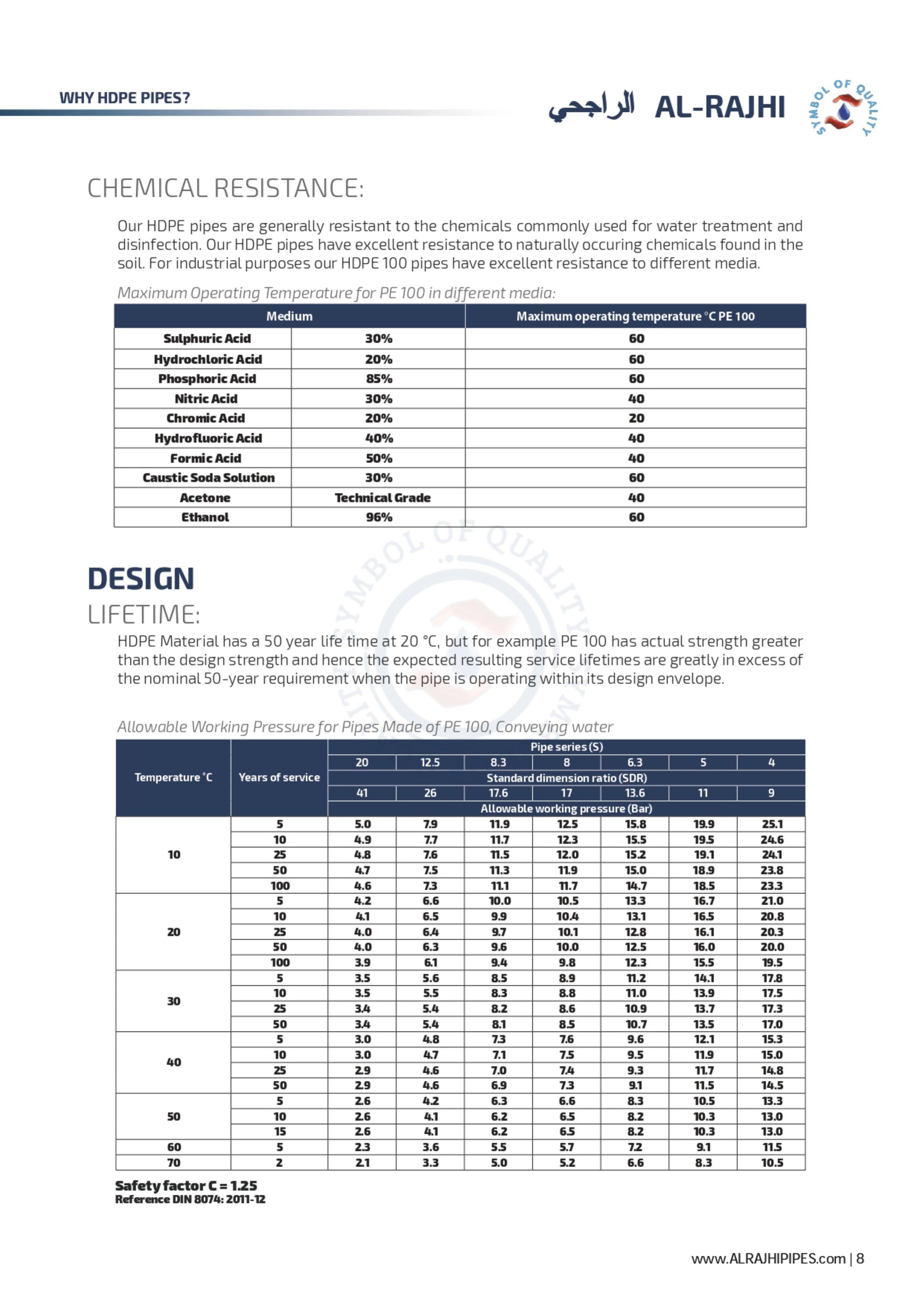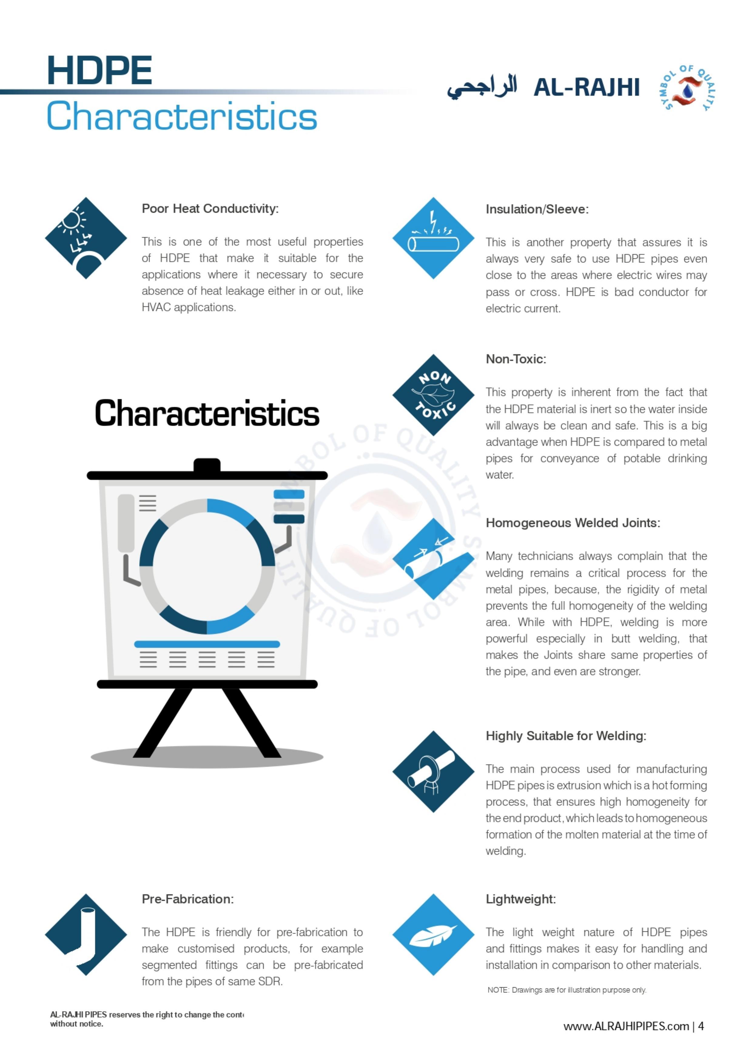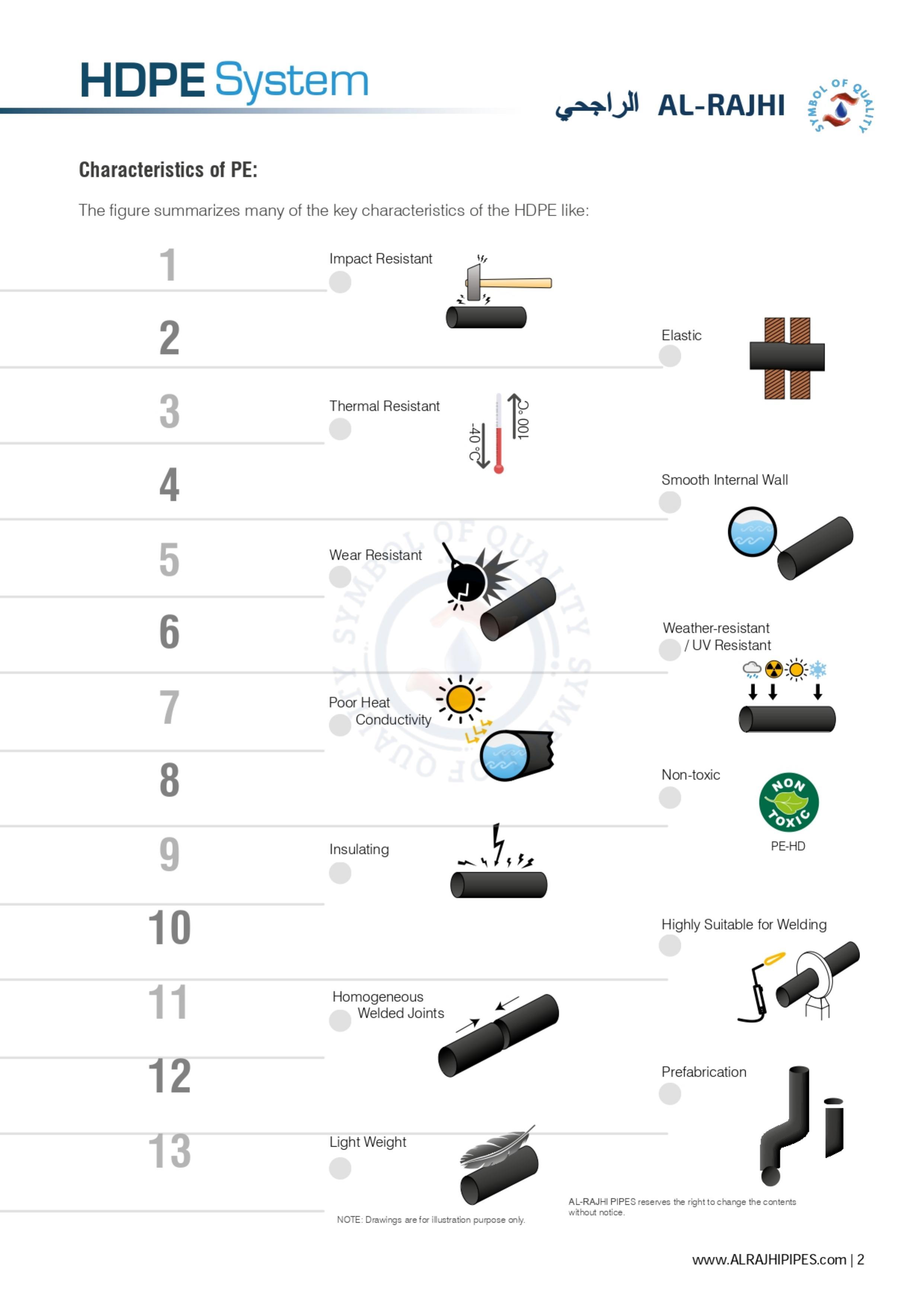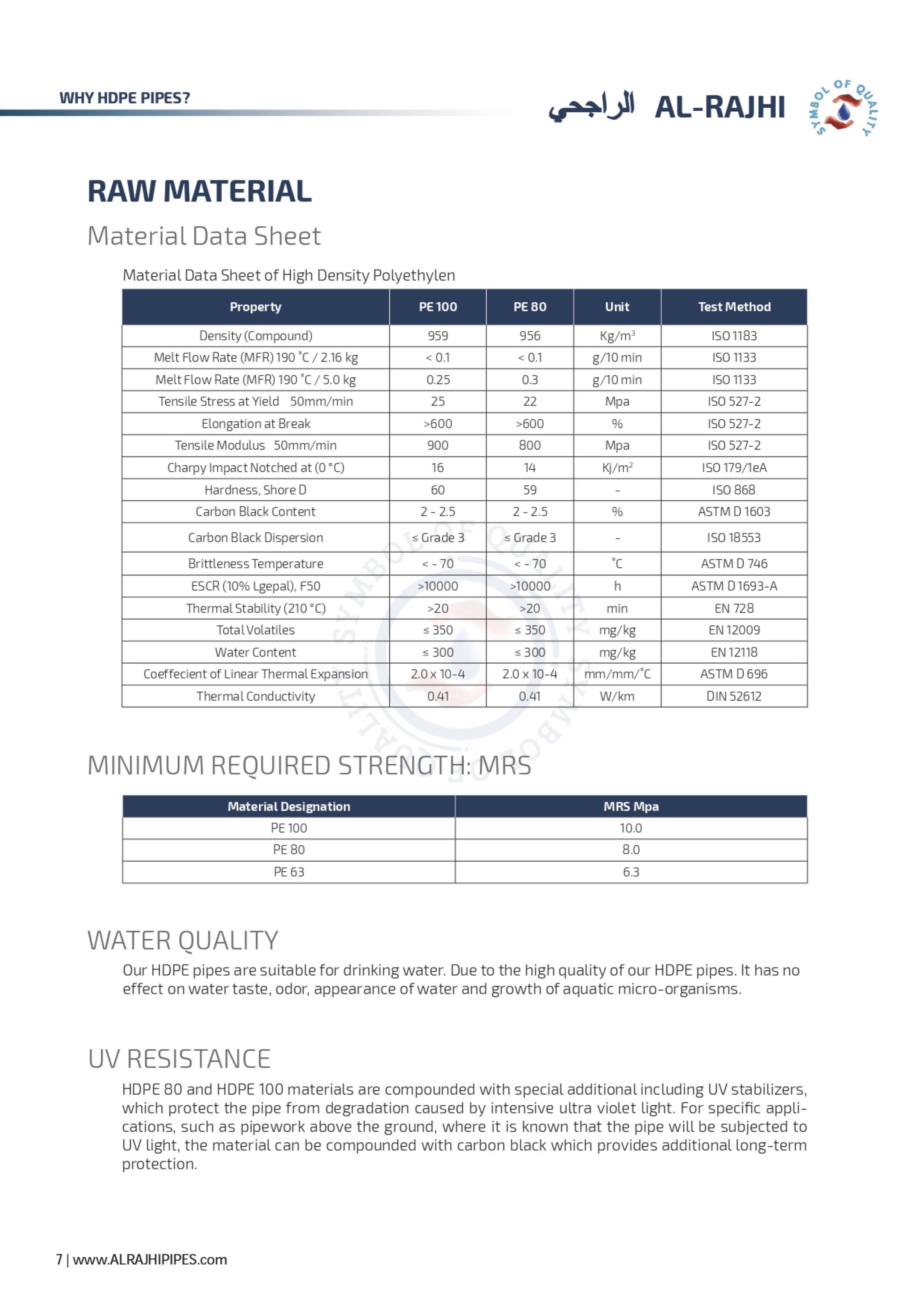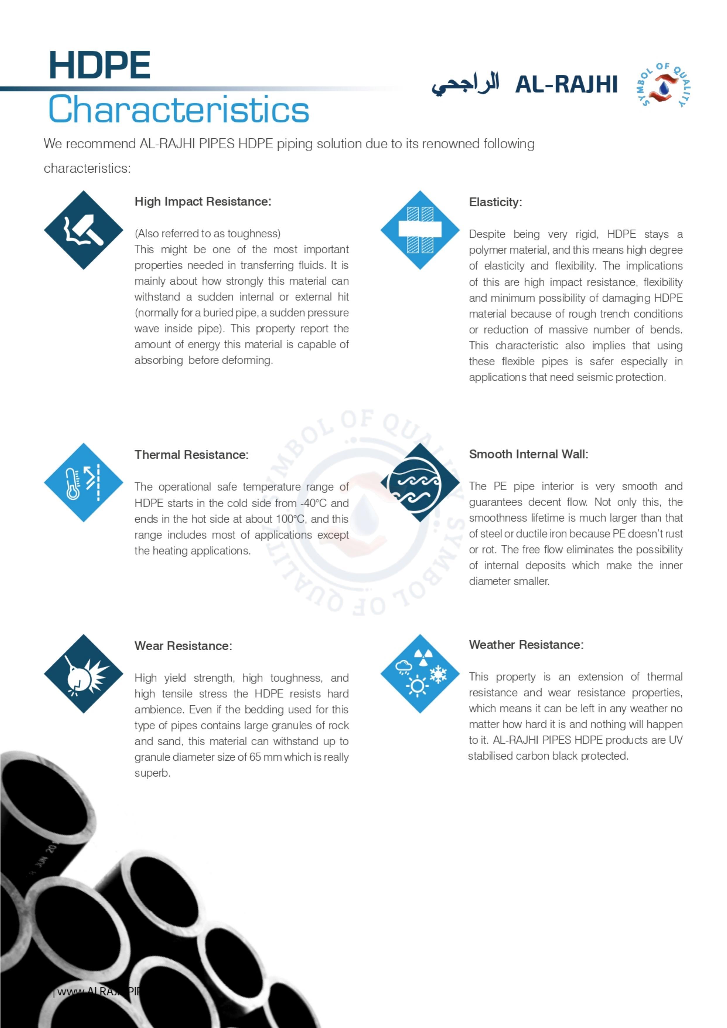 This property is an extension of thermal resistance and wear resistance properties, which means it can be left in any weather no matter how hard it is and nothing will happen to it. AL-RAJHI PIPES HDPE products are UV stabilised carbon black protected.
