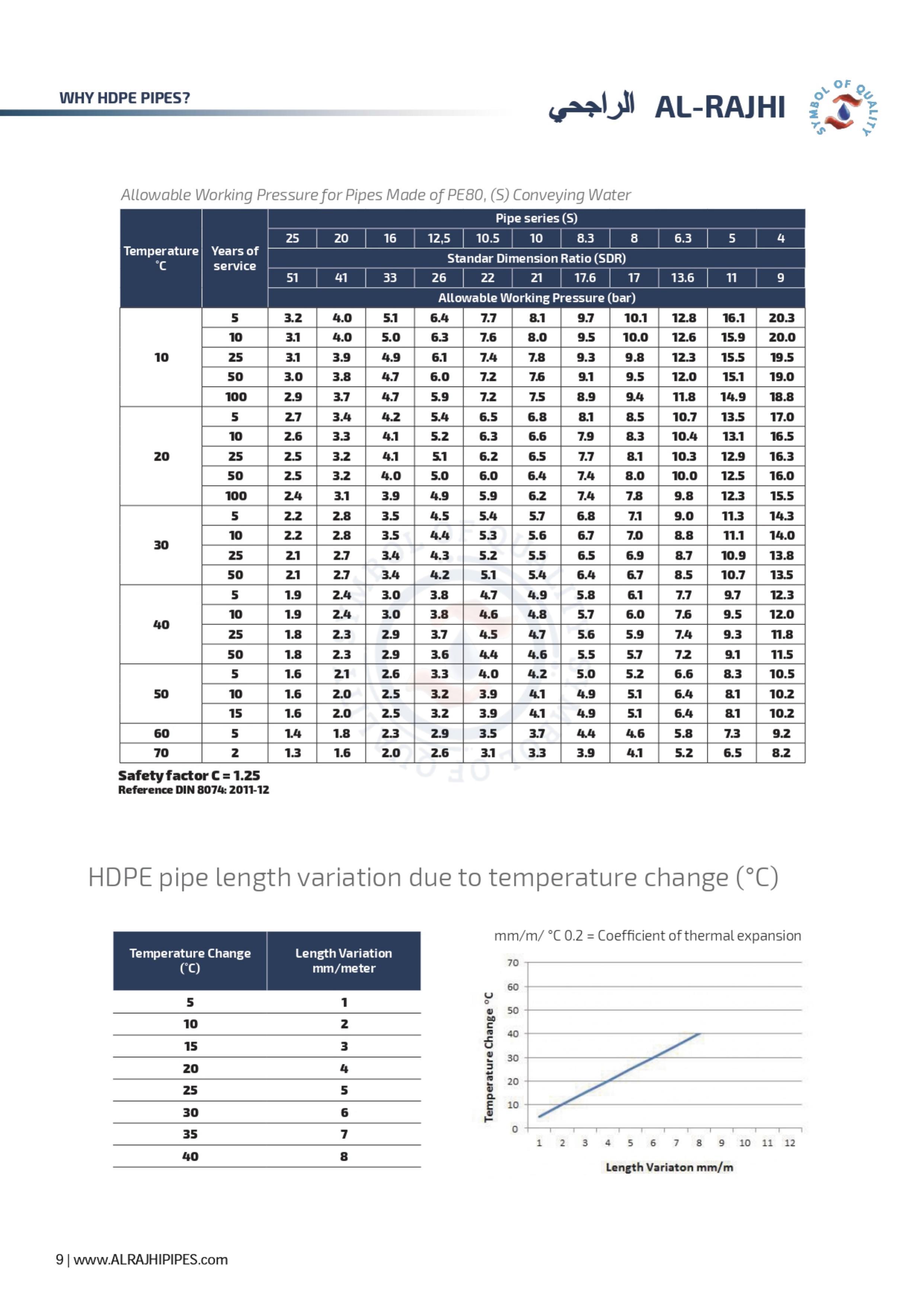 The operational safe temperature range of HDPE starts in the cold side from -40°C and ends in the hot side at about 100°C, and this range includes most of applications except the heating applications.