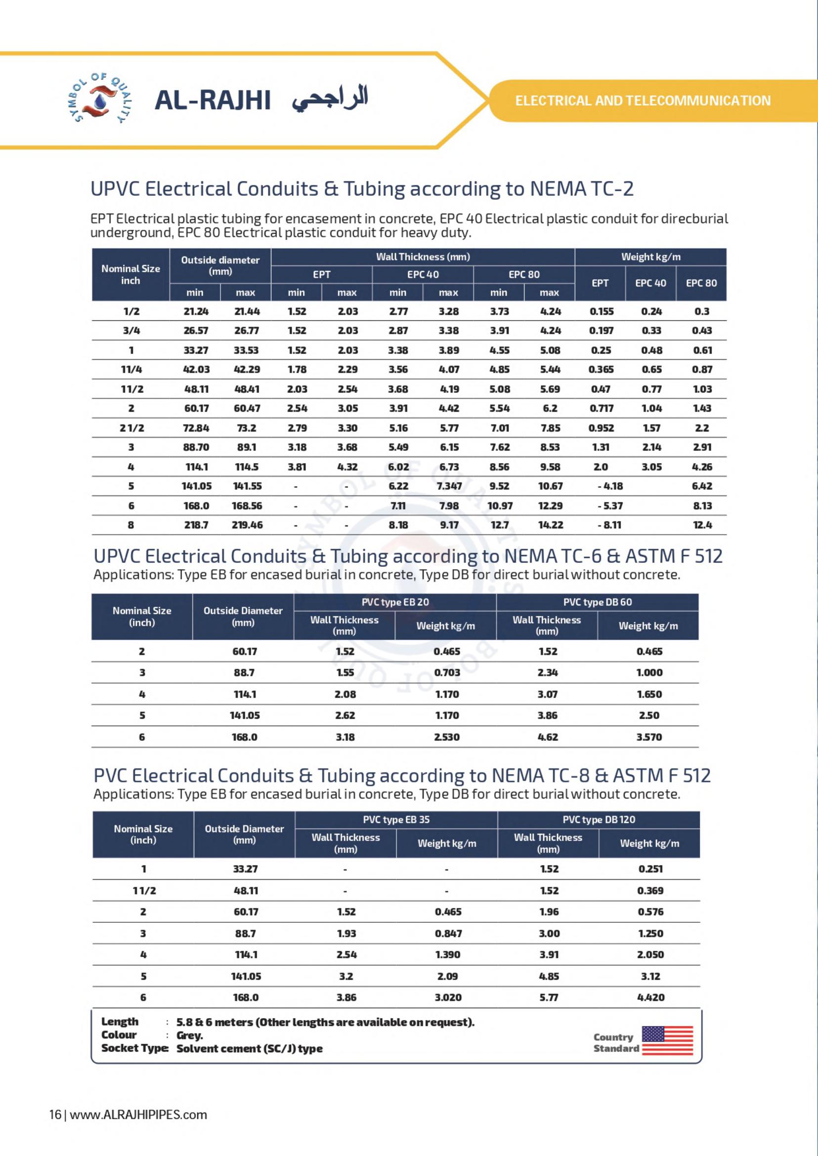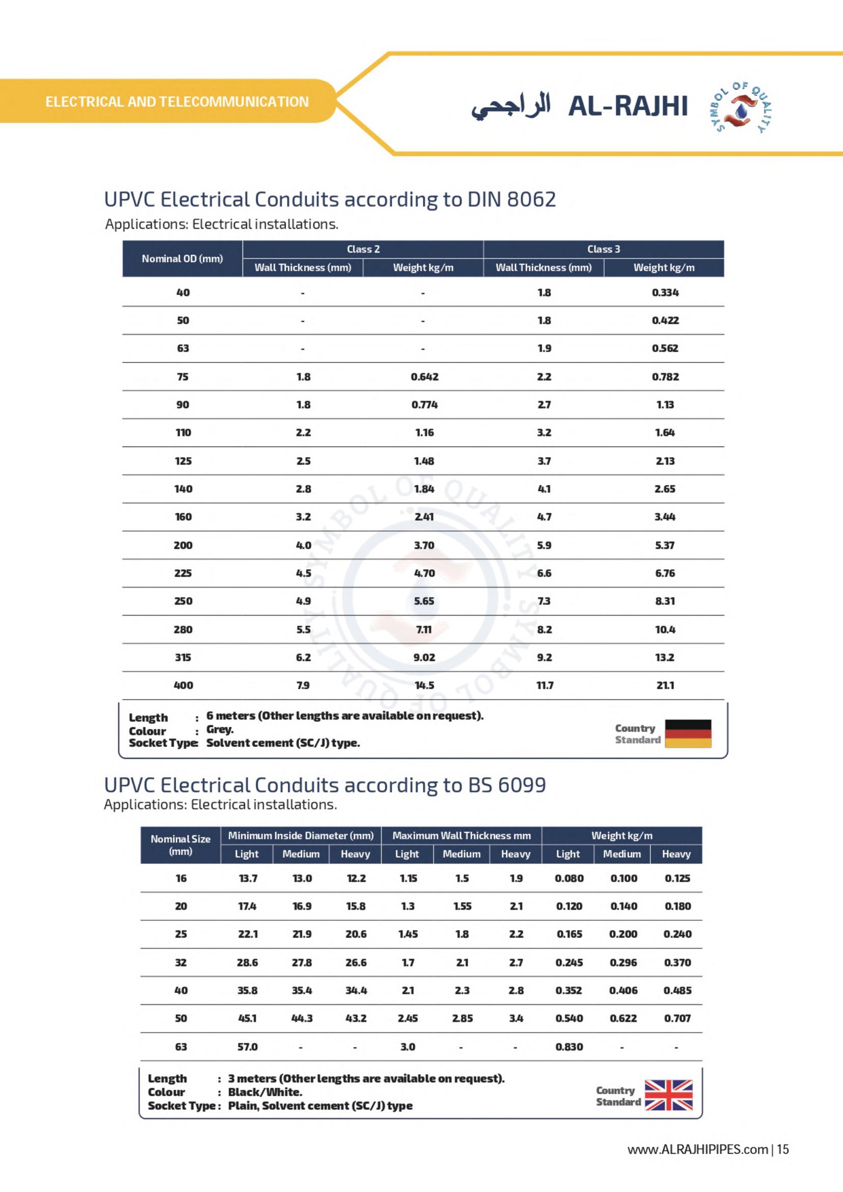 AL-RAJHI uPVC pipes form in an integral insulator, hence there is an ever-increasing demand for them as electrical conduit. To facilitate work, a full line of fittings is available and fabricated from the same material as the pipes.